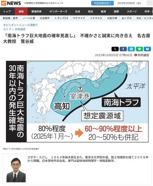 鷺谷威教授が、南海トラフ地震の長期評価改訂について、共同通信社に寄稿した解説文が『「南海トラフ巨大地震の確率見直し」不確かさと誠実に向き合え』の見出しで、ウェブ掲載されました。(2025年10月5日)